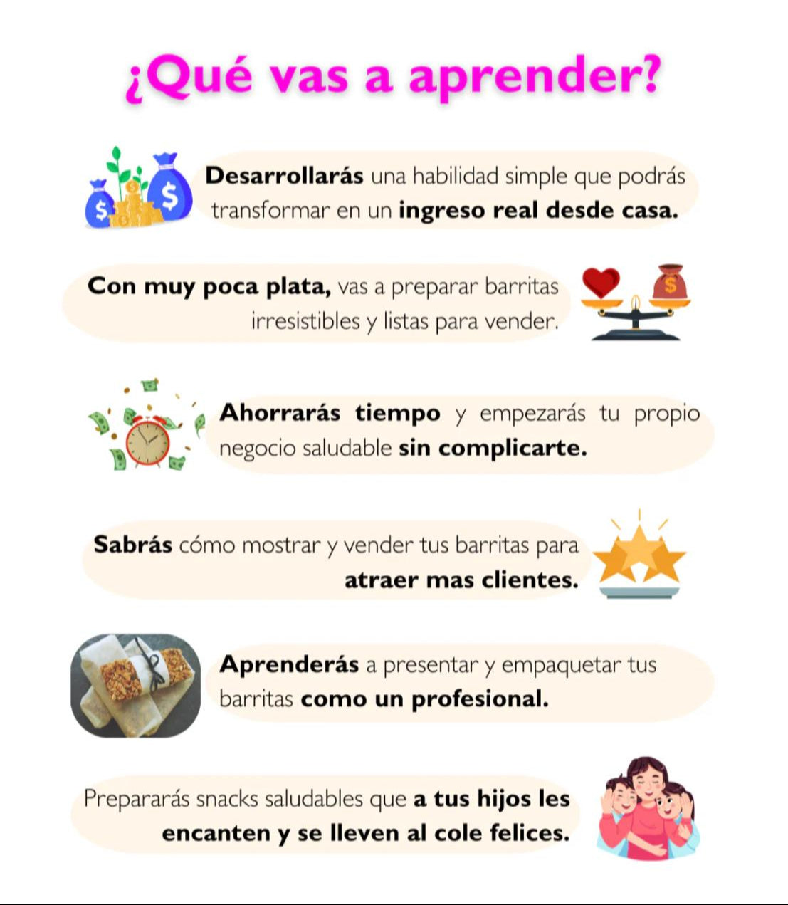 - Podés hacer barritas para tu familia o para emprender tu propio snack saludable.